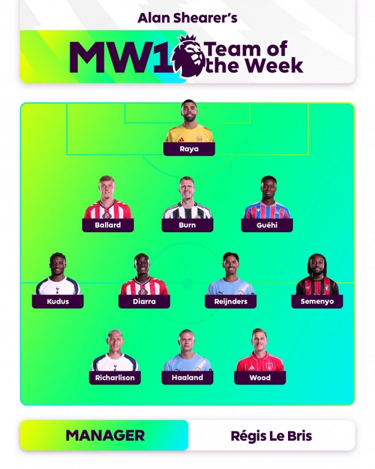 8月20日讯 英超首轮战罢,希勒评选出本轮比赛最佳阵容,哈兰德、理查利森领衔锋线,赖因德斯在列。值得一提的是桑德兰有三人入选。