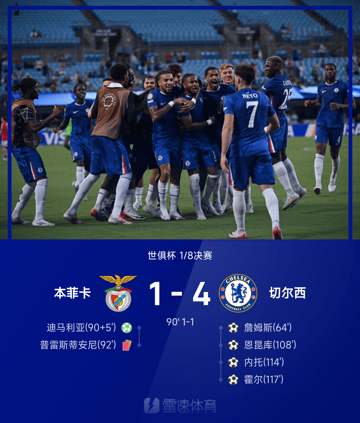 06月29日讯 25赛季世俱杯1/8决赛,切尔西4-1战胜本菲卡,成功晋级8强,下一轮将战帕尔梅拉斯。